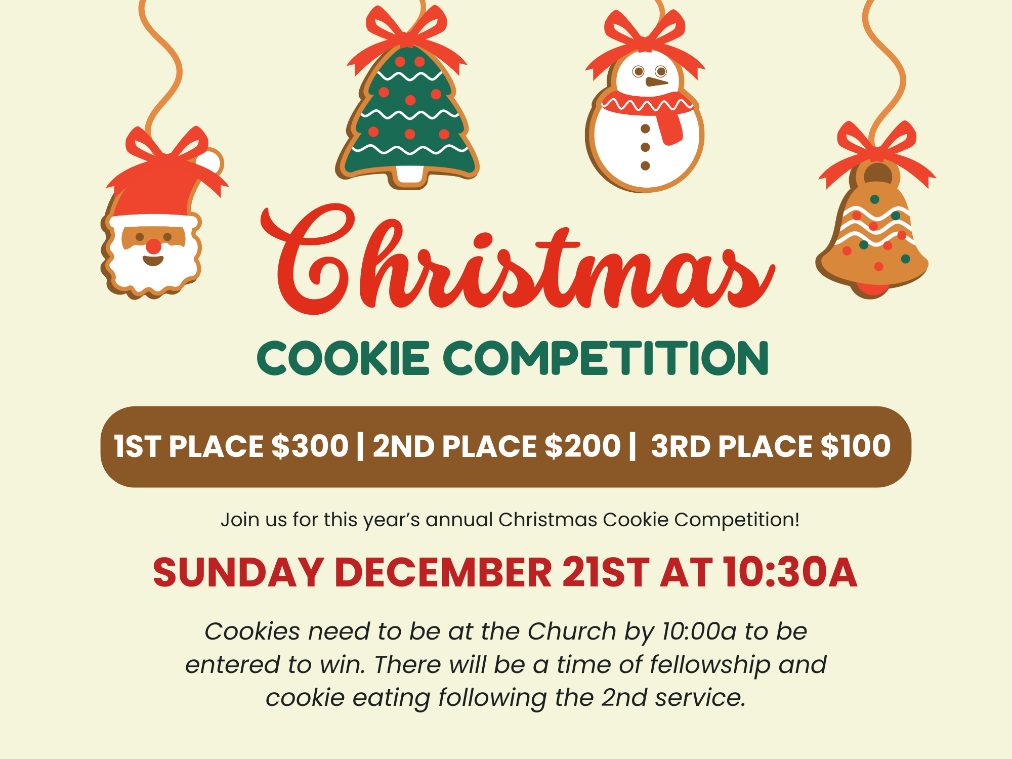 The 2025 Christmas Cookie Competition is to be held Sunday, December 21st during the second service. Cookies must be at the church no later 10am to be entered in the competition. You must follow all the rules listed below to be considered for the prize.